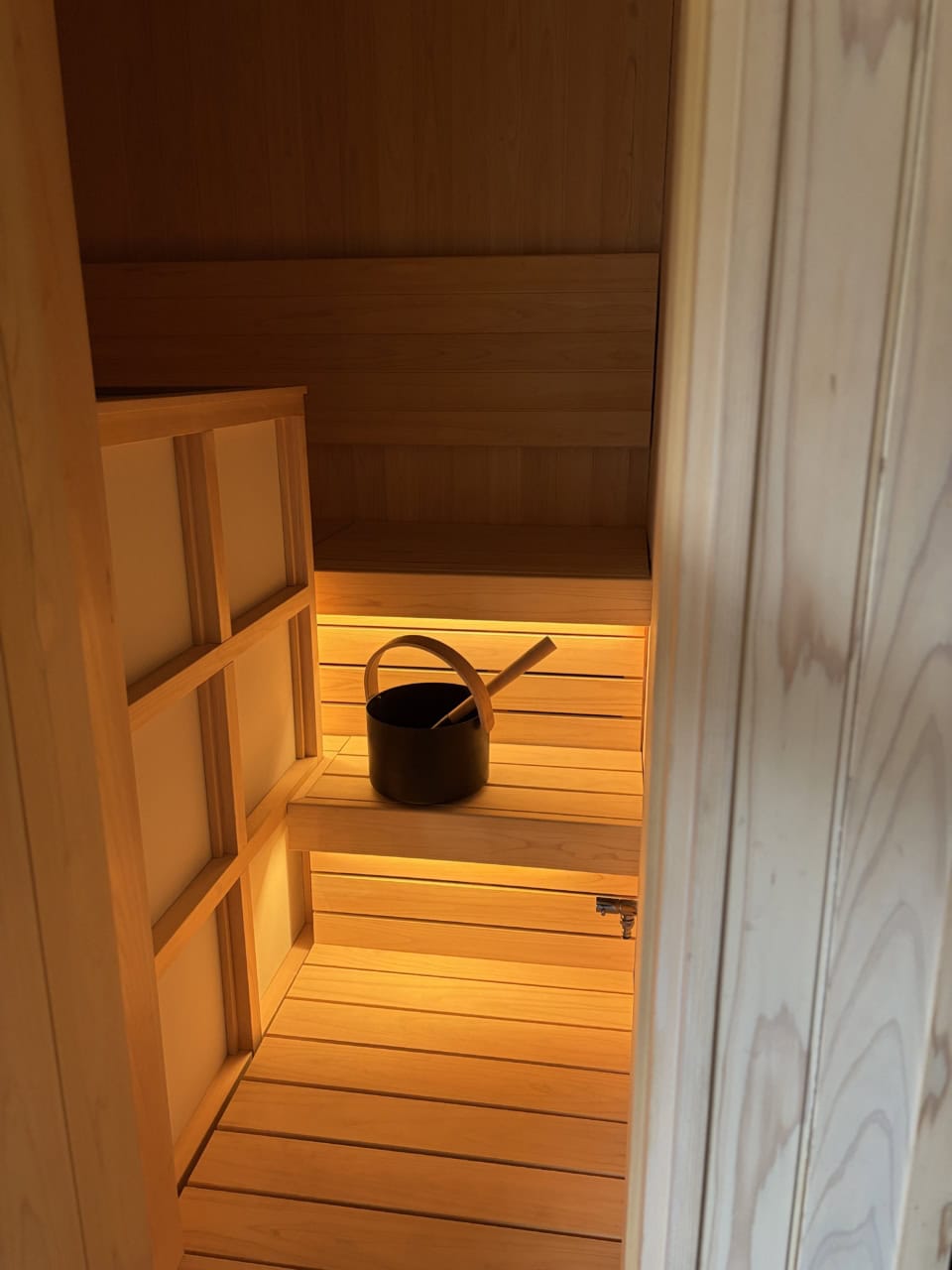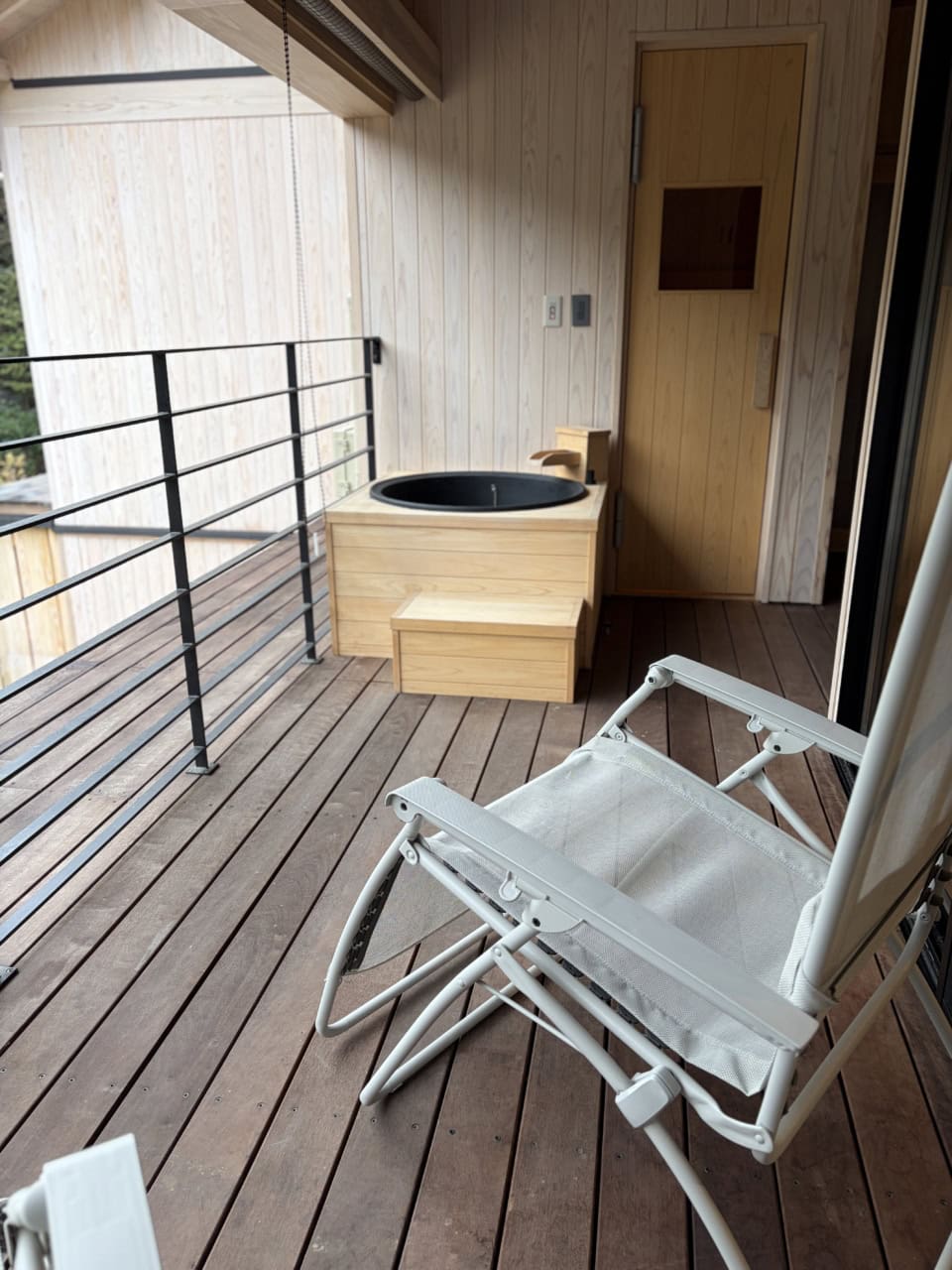 全客室の2階には、プライベートサウナ、水風呂、外気浴ができるテラスも完備。こちらも温泉同様、好きなときに好きなだけサウナが楽しめるってのがイイですよね。筆者はととのったら眠くなるタイプなので、ベッドに直行できる動線も気に入りました!