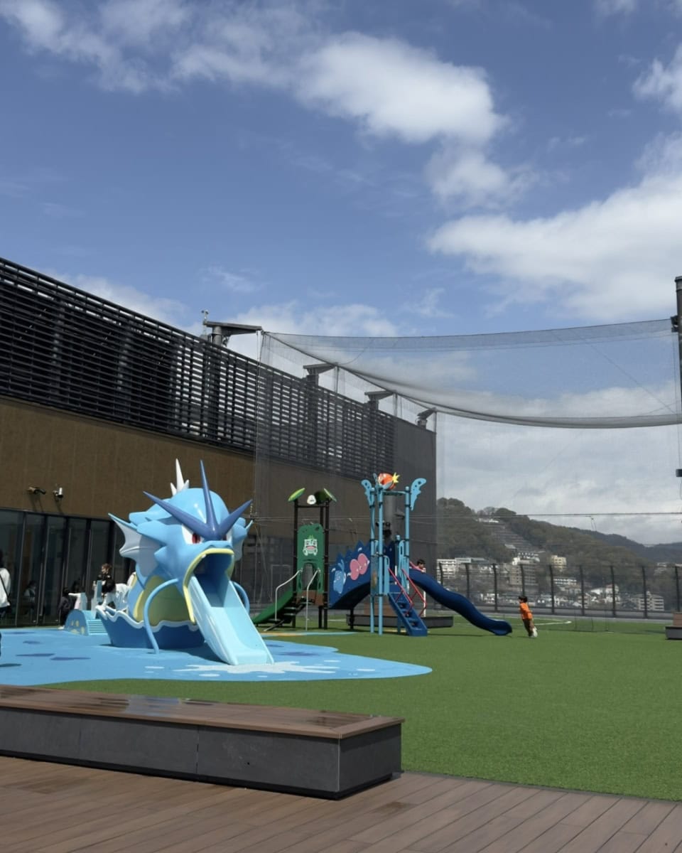 駅直結のminamoa(ミナモア)の9階屋上にまたもやギャラドス登場! ここは【ソラモア広場】という芝生がある休憩スペース。飲食もできて、子どもも遊ばせることができるので、子連れお出かけで重宝する場所です。こちらに【ギャラドスひろば by ポケモンセンターヒロシマ】があって、滑り台などの遊具を楽しめます。ポケモンに触れあいながらのびのび。コーヒー片手に子どもが遊んでいるところを見守ることができるので、親にとってもありがたい環境でした。